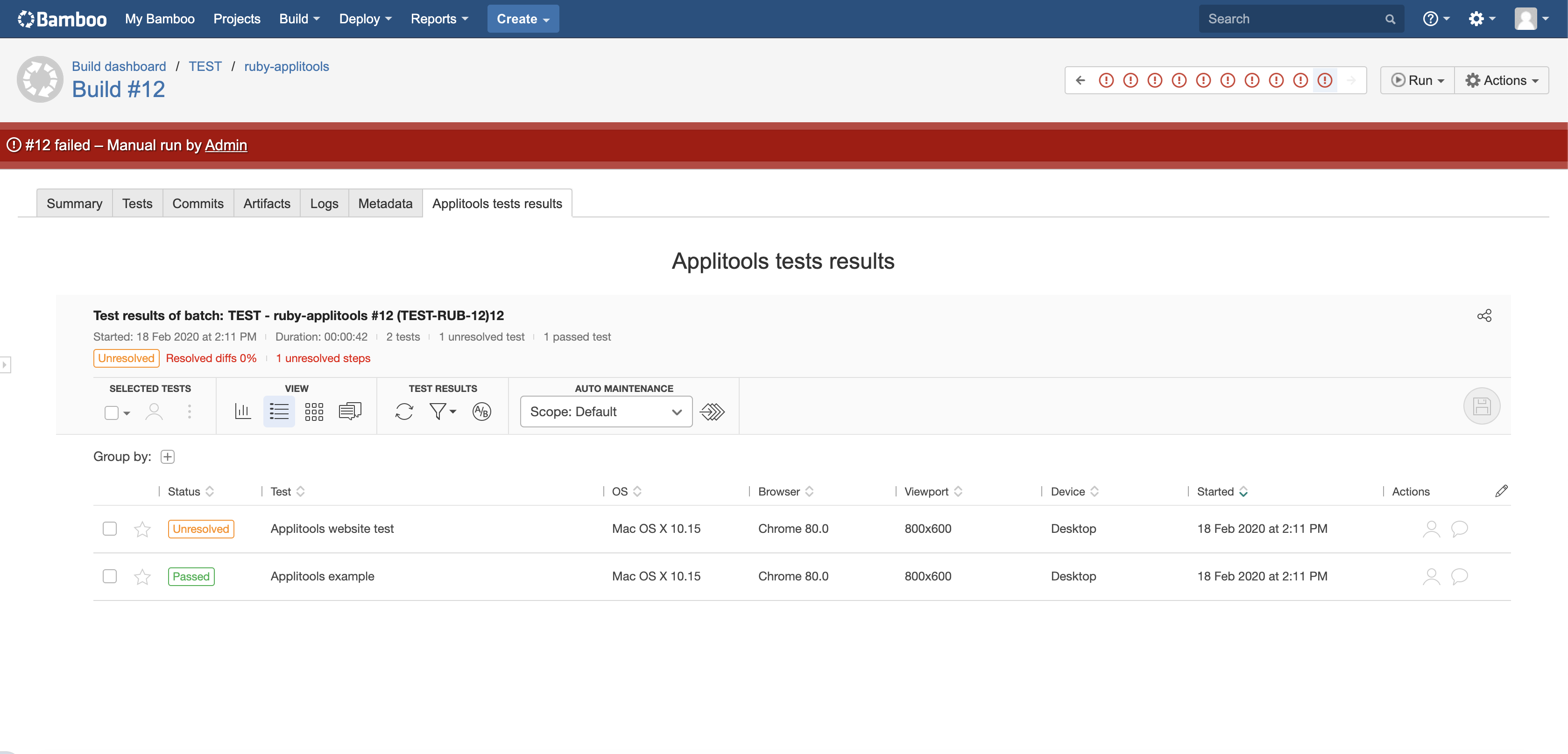 After your test has run, you can see the results on the Applitools test results tab on the Bamboo Build results page.