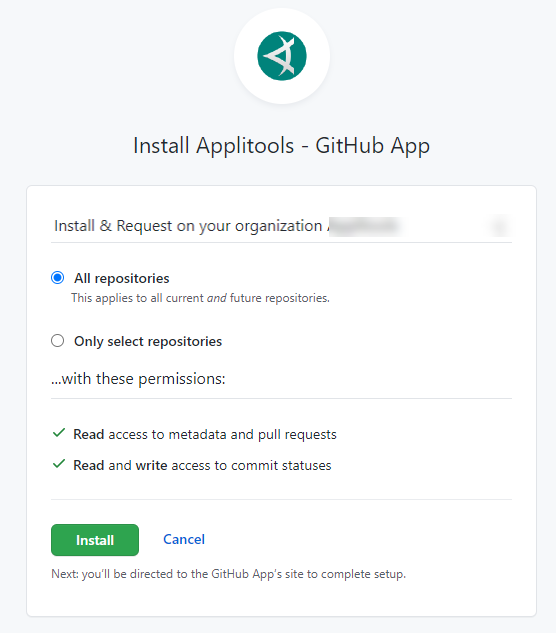 The GitHub wizard asks you which repositories you want to allow the GitHub App to access and tells you what access type is being granted. We recommend that you allow access to all current and future repositories, since this GitHub App installation serves your entire organization.