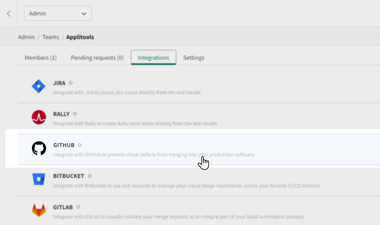 If you want to continue using the legacy Applitools direct integration, skip the next section. Instead, follow the instructions described in Configuring direct Eyes/GitHub integration and then continue with Configuring GitHub repositories.