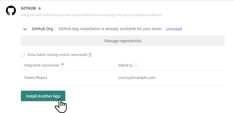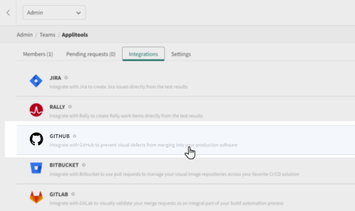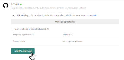Eyes/GitHub integration is based on a GitHub App created by Applitools that defines the minimum access that Eyes requires to interact with GitHub on the repositories where Eyes tests are run. You can install multiple GitHub Apps that represent different GitHub Organizations for each team.