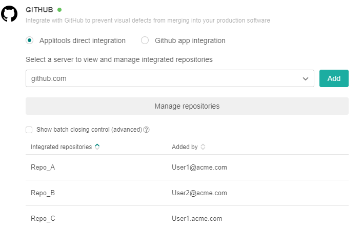- Select the Show batch closing control (advanced) check box. The Test Manager adds an another column labeled Automated batch closing that provides a toggle switch for each repository in the list of repositories.