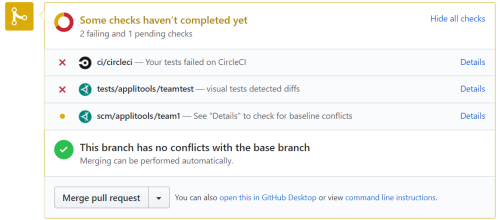 As described above, the item on the GitHub pull request page marked scm/applitools/team-name indicates the merge status of the Eyes baselines in the source branch.