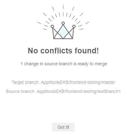 Click on the Details link for this item, to view the Test Manager Merge branches page preloaded with the source and target branches derived from the pull request. If there are no conflicts, then the Test Manager displays a pop-up window to confirm this.