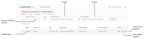 An alternative to resolving each test individually is to use the checkboxes at the start of each row to select rows and then use the buttons in the toolbar at the top-left of the window to choose how to resolve the selected rows. The toolbar also has buttons that allow you to delete selected baselines in the source branch or undo the resolution made for the selected baselines.