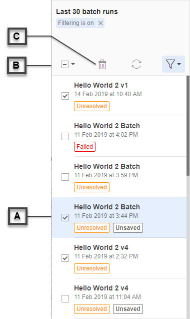 - Select the batches you want to delete by clicking the checkboxes [A] to the left of each batch entry in the batch list.