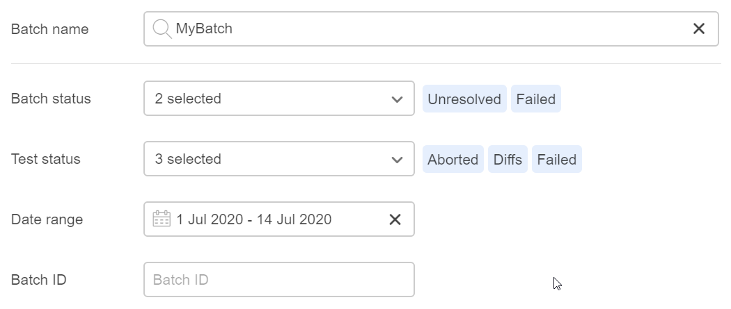 You can specify the batches you want to see based on the batch name, the batch status, the test status, the test range, the batch ID and user defined properties.