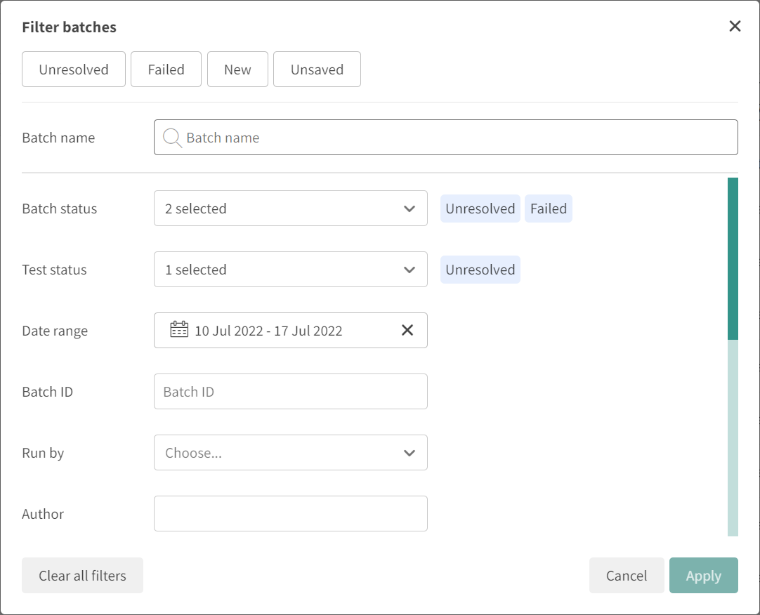 - Batch status: Batches with a status that matches one of the states you select from the list which opens when you click the Choose... field. You can select the following options: Unresolved, Running, Failed, Unsaved, or Passed.