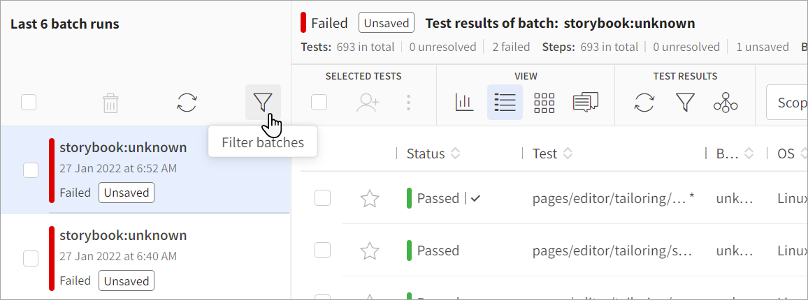 The batch list in the left pane of the Test results page has entries for batches that have been run in the past or that are currently running. You can filter this list based on a set of criteria, so that the batch list only displays batches that meet those criteria. Filtering makes it easy to find batches with a particular name or to find batches with tests in a particular state or condition. You can also use filtering to find batches you want to delete and then delete them in one command (see How to delete batches).