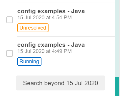When you set a filter, Test Manager displays the 30 most recent batches that meet the criteria of the filter. When you scroll down to the end of the list, if there are older batches that meet the filter criteria and are not yet displayed, you will see a Search Beyond <date> button, where the <date> is the date when the last batch in the list ran. Click the button and more entries will be displayed.