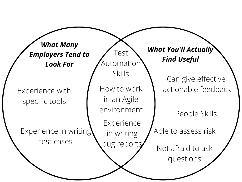 It may be surprising that there can be a difference between the what employers look for and what will be most useful for you. The difference can arise because the person writing the job ad might not always know what skills a software tester needs.