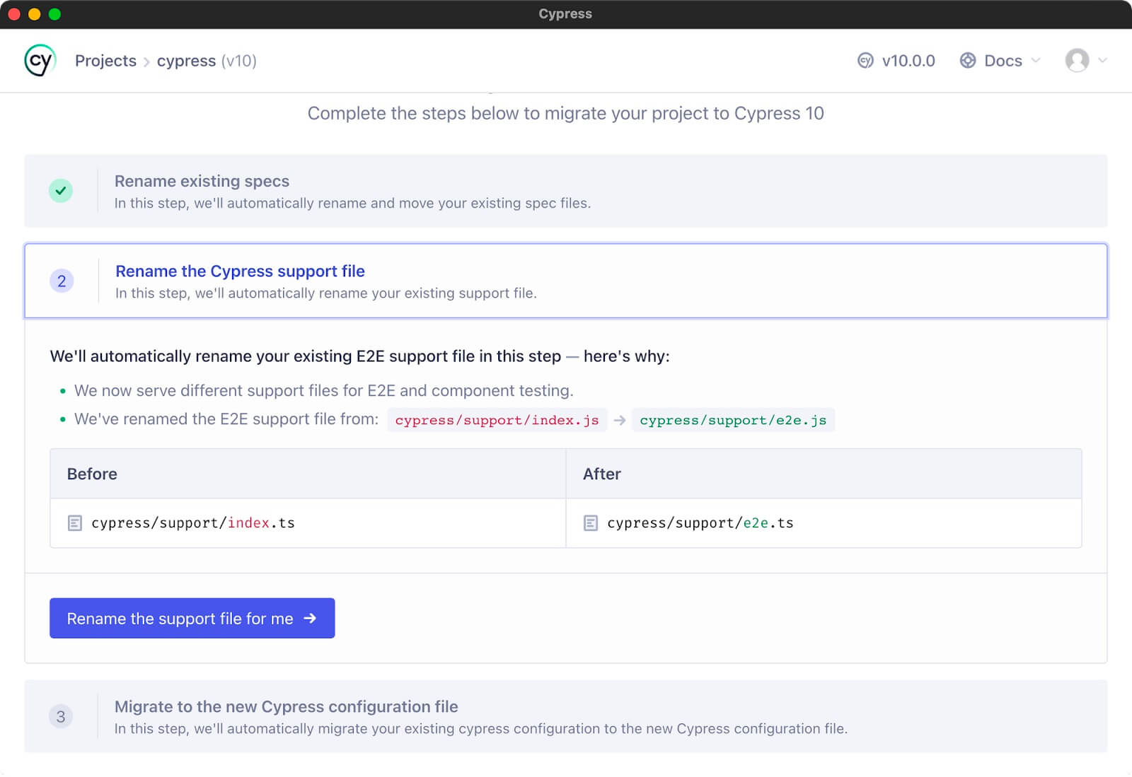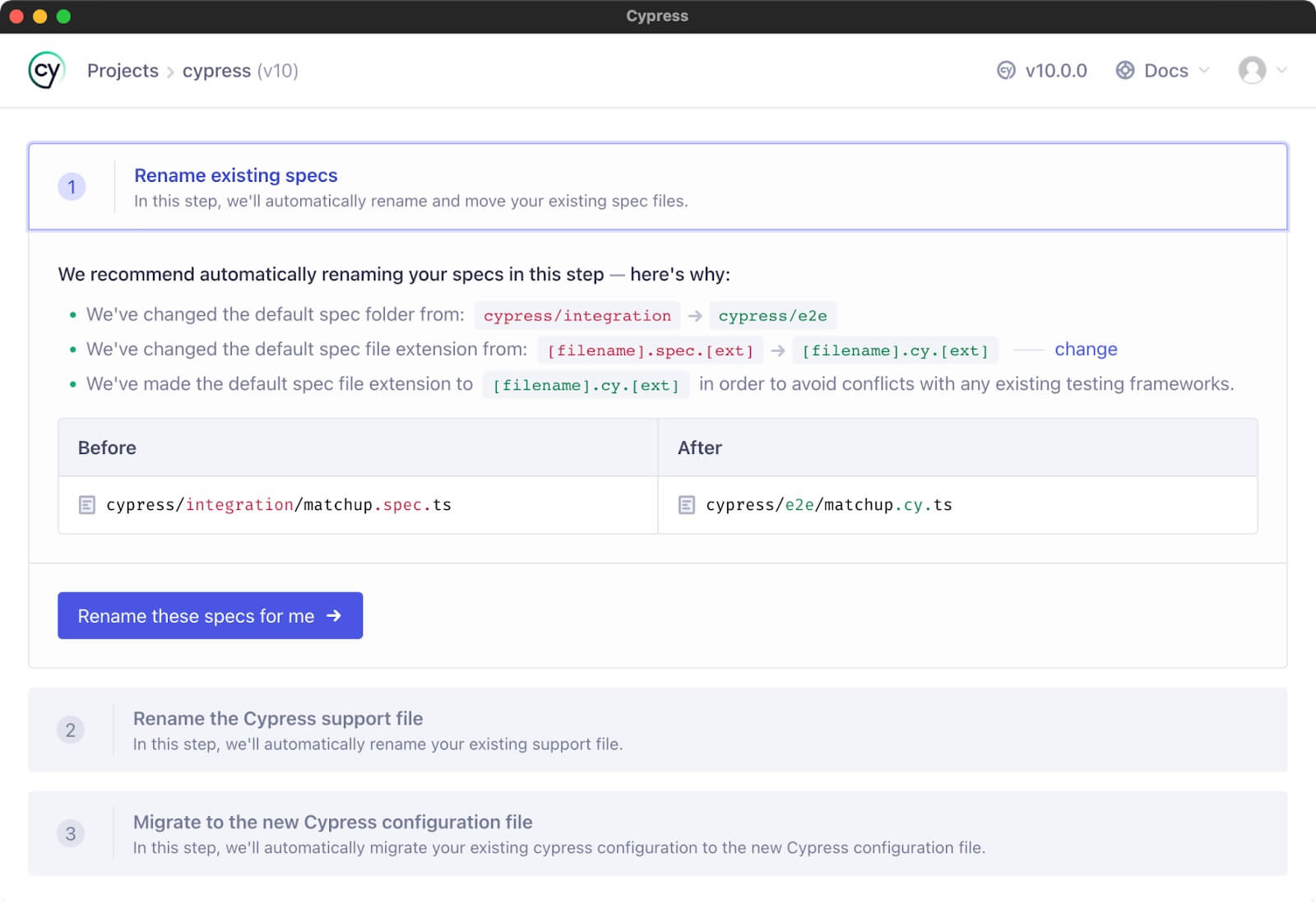 Feeling overwhelmed by all the changes? No need to be! The Cypress team has prepared a migration assistant that will make sure the transition of your project is seamless. In three easy steps you can change the names and folder of your e2e tests: