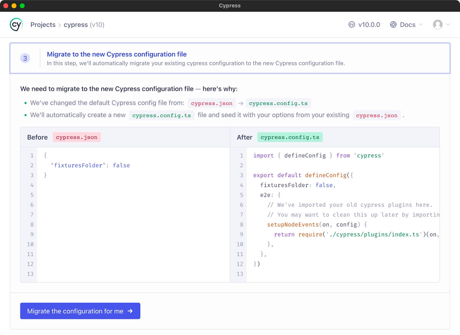 and most importantly, migrate your cypress.json to a cypress.config.js file.
