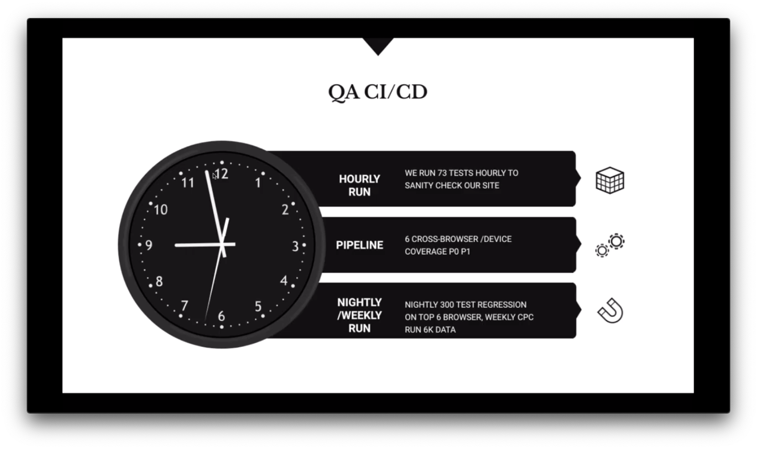 - By October 2018 they had fully automated P0/P1 tests. Her team had added Spinnaker pipeline integration. They were running cross-browser testing with real mobile device tests.