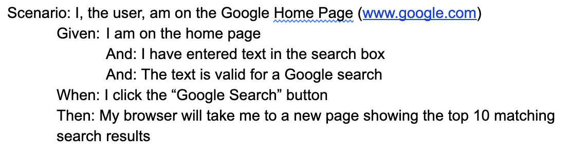 - Since the scenario specifies that the test uses valid text for a Google search, define valid text.