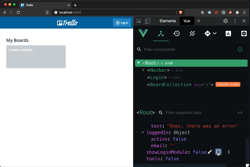 Vue.js comes with some amazing developer tools. These enable you to change the state of your app right from devtools. Look at how I’m able to toggle the visibility of our login element with these tools: