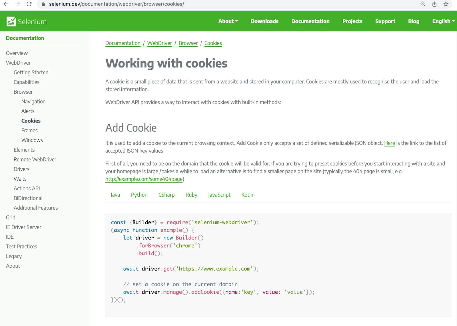 Different frameworks provide the option to use cookies in your test automation. Selenium Webdriver has a command called addCookie. This is used to add a cookie to the current browsing context. It accepts a set of defined JSON objects and shows you examples in the different languages that Selenium Webdriver supports.
