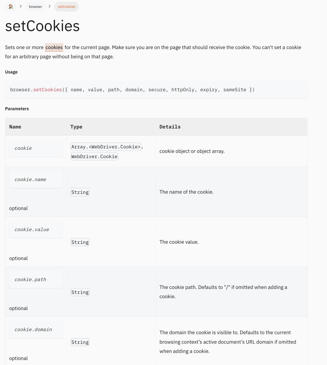 WebdriverIO also provides the option to manipulate and interact with cookies. The command is called setCookies. A cookie can be set for an arbitrary page without being on that page and it details how you go about setting different cookies.