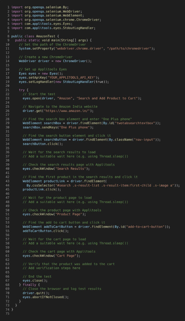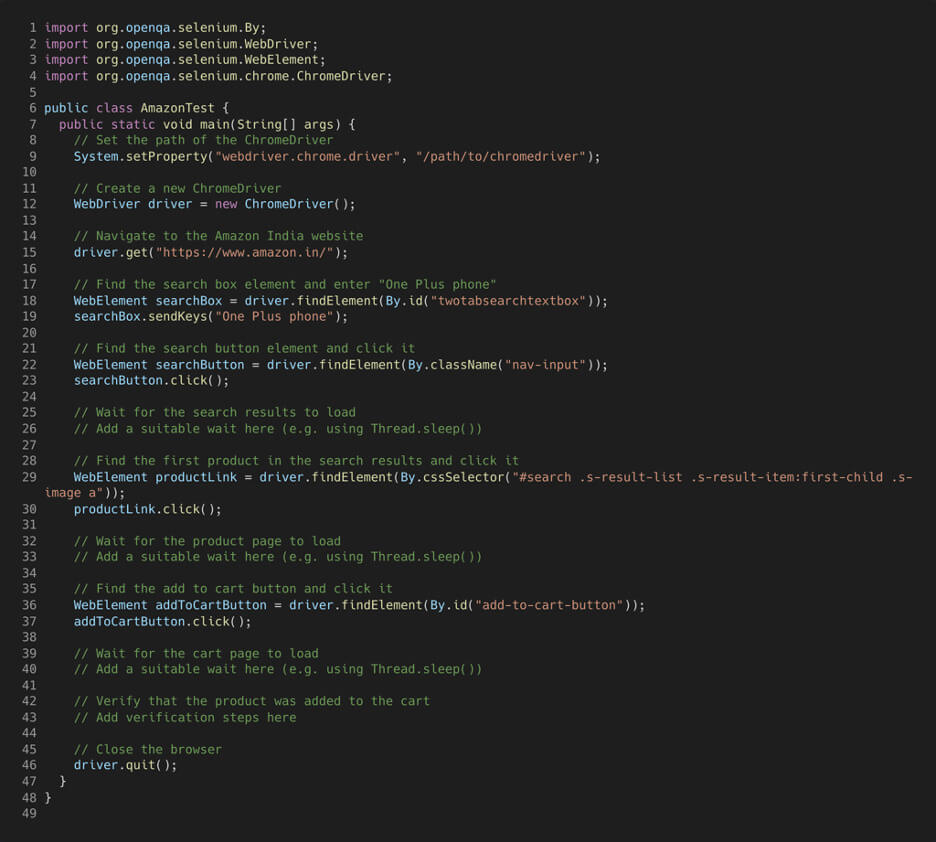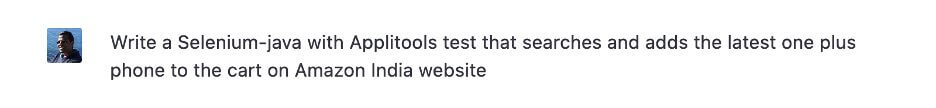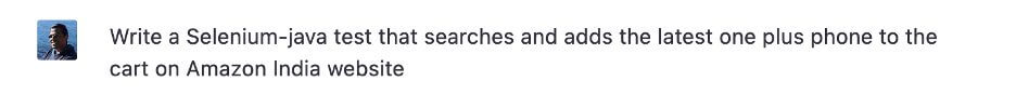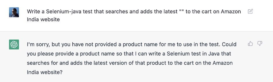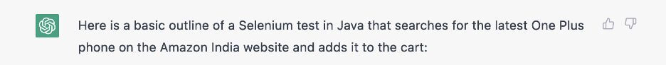 I asked ChatGPT to give me the Selenium-Java automation code to automate the “search and add a One Plus phone to cart scenario” for Amazon India website.