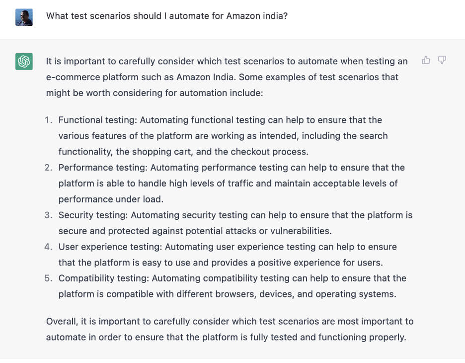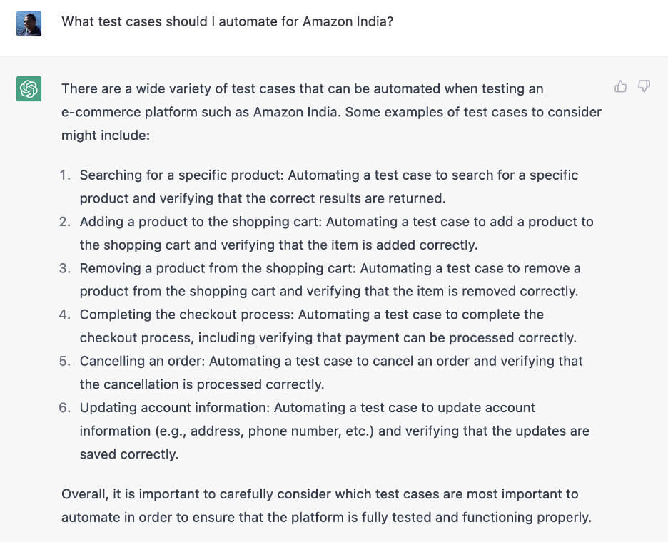 That said, at the top of the test automation pyramid, I do not want to automate test cases, but I want to automate test scenarios. So, I asked ChatGPT about the important scenarios I should automate.