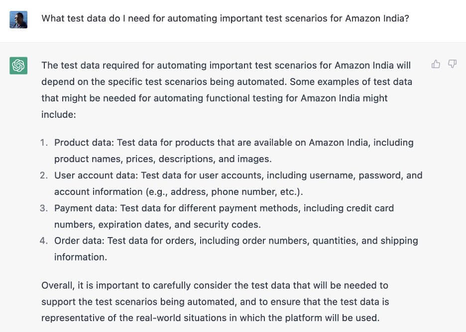 Again, I was blown away by the detailed test data characteristics that were given as a response. It was specific about the relevant data required for product, user, payment, and order to automate the important test scenarios that were highlighted in the earlier response.