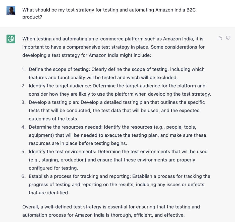 I asked ChatGPT to create a test strategy for testing and automating Amazon India shopping app and website.