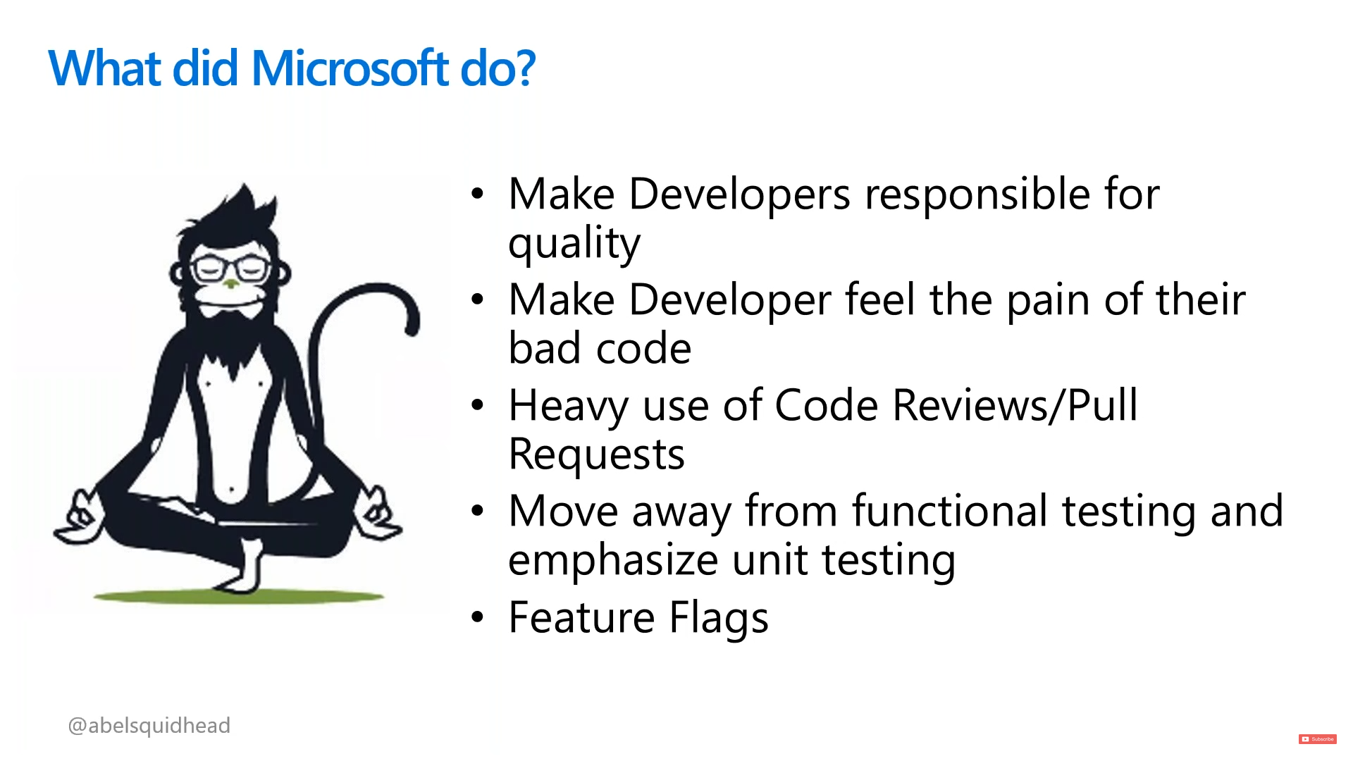 Abel then relayed the five strategic changes that Microsoft employed to deliver speed and quality to their software development. They were: