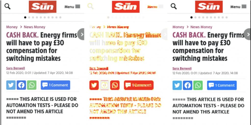 Most of the existing open source tools for visual testing only runs on 1 or 2 browsers. For example, one of the tools that we were using before, called BackstopJS, which is a popular visual testing framework, only runs visual tests on Chrome headlessly. AyeSpy, which is a tool that was actually created by one of the teams here at News UK, is another visual testing tool, which hooks into your Selenium Grid to run your visual tests on different browsers. But still, it’s a bit limited. If you are using the Selenium Docker images, they only have images for Chrome and Firefox. What if you want to run your visual tests on Safari or Internet Explorer? You can definitely verify this yourself, but again as mentioned, it’s time consuming.