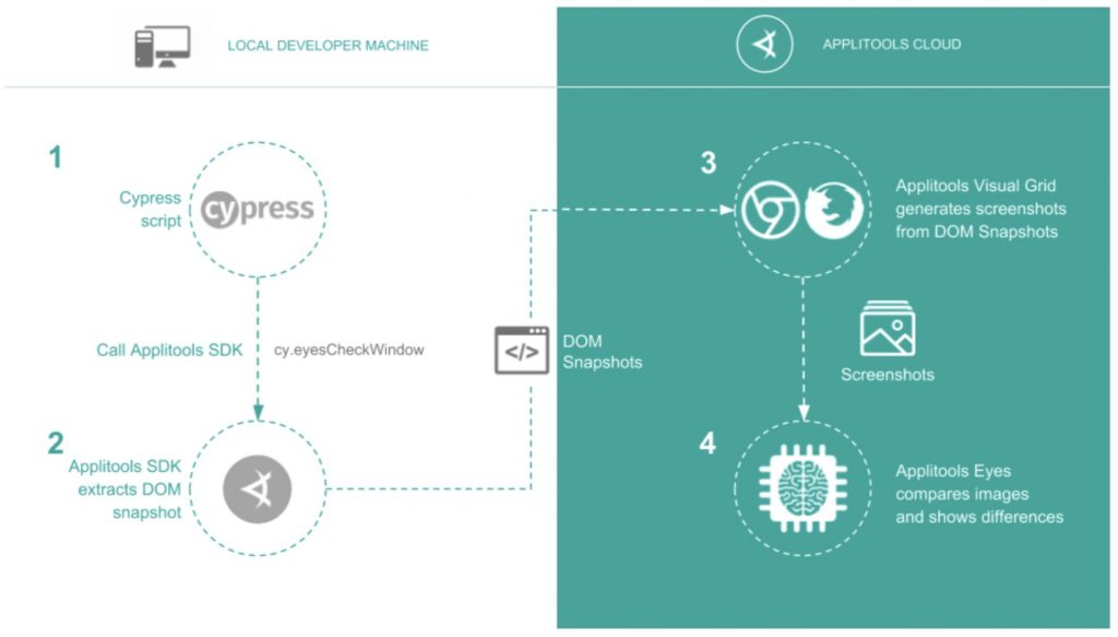 Rather than taking a screenshot, Applitools will extract a snapshot of your DOM. This is one of the reasons why visual tests are fast to run in Applitools. Once the DOM snapshots have been uploaded to the Applitools Cloud, the Applitools Ultrafast Grid, which offers users a way to render screens in multiple browsers and viewports simultaneously to generate the screenshots and do the AI powered image comparison.