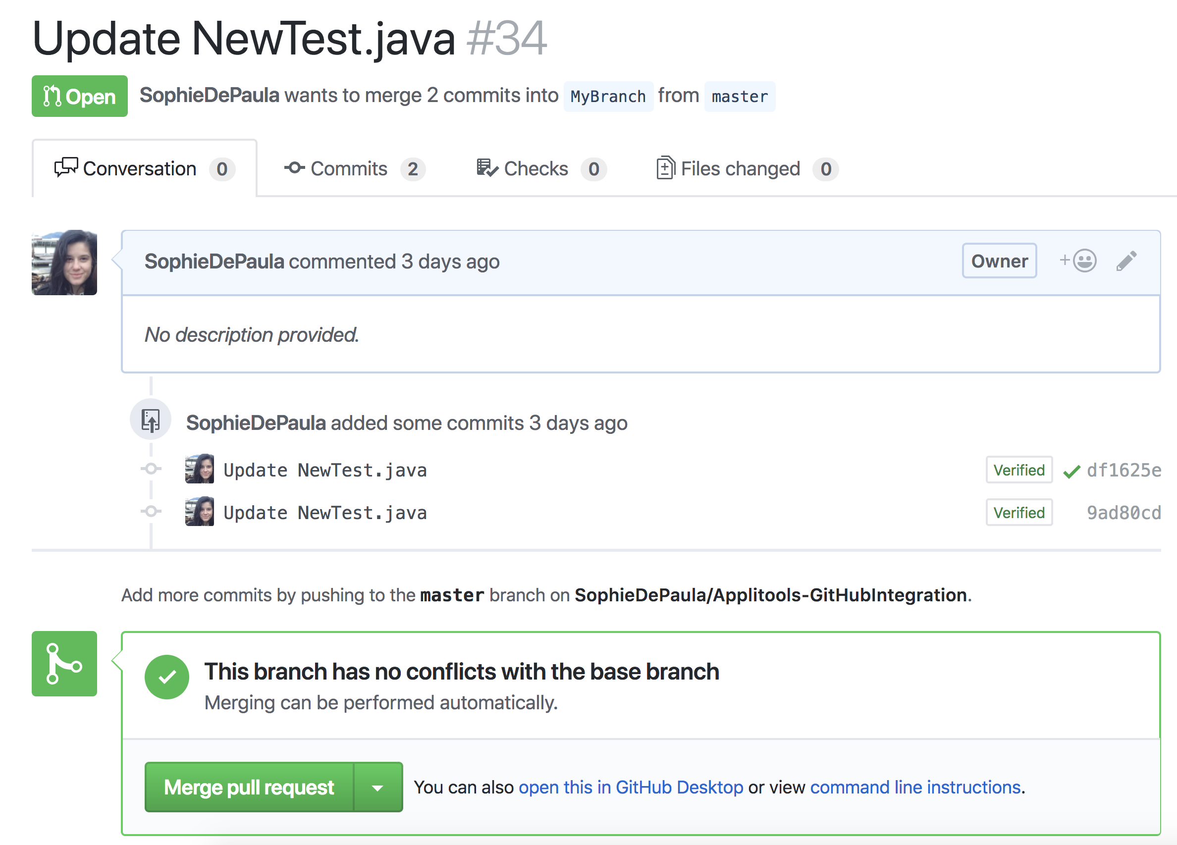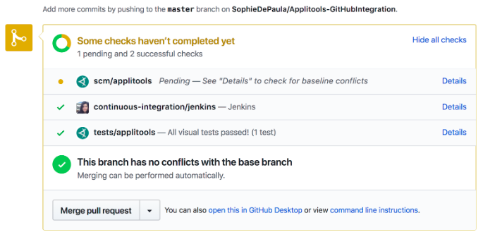 Either way, the status will be updated in the pull request. And, if you run Applitools tests, the Applitools status will also be updated.