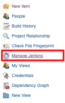 Here’s what you’ll see when you run each of those commands. First, the Manage Jenkins command, in the menu bar on the left side: