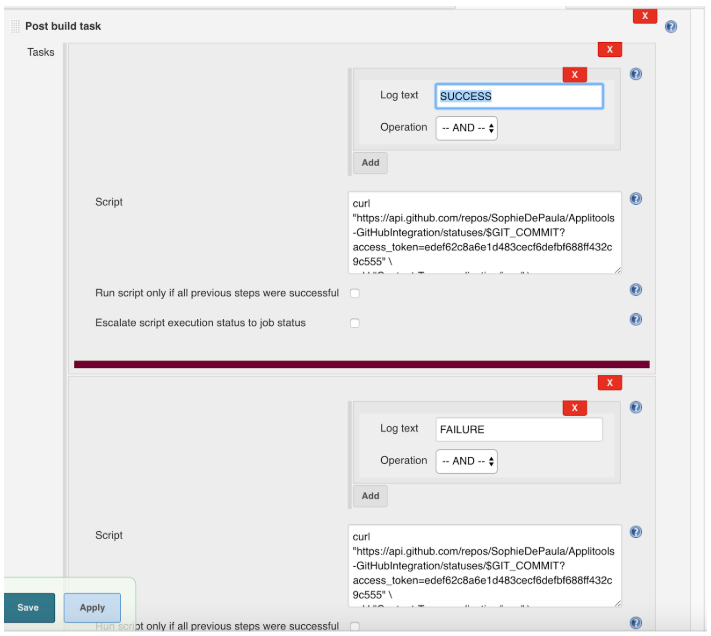 The next step is to go into your Jenkins project post build actions, and add two post build tasks. One task for success, and another for failure. You will need those actions to distinguish between a successful build and a build that failed.