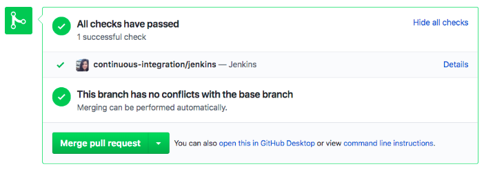 Now that you’ve configured both Jenkins and GitHub, the commit status will be shown in the GitHub pull request page when you merge a PR: