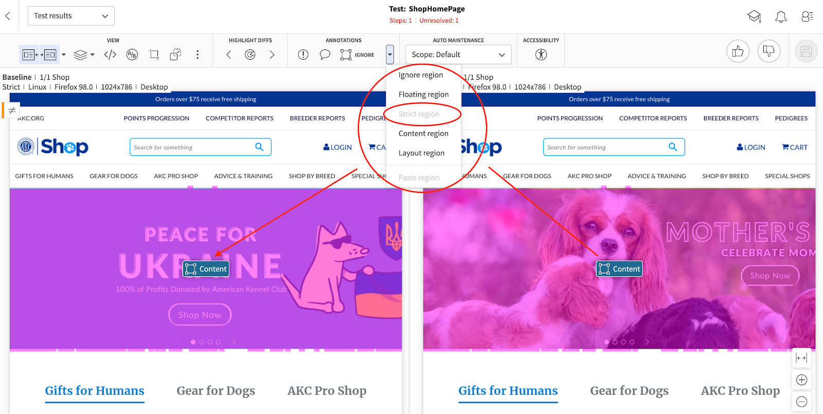 - You can use one algorithm on top of the other. Other solutions only offer the possibility of setting a level of comparison based on three modes, either Strict, Suggested (Normal) or Relax, and this is useful to some extent. But what happens if you need to select a certain region of the page to use a different comparison algorithm? Well, this is possible using the Applitools Region Types feature: