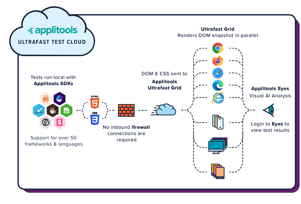 Think and analyze the time that it currently takes to complete a full testing cycle on your end using traditional cross-browser testing solutions. Going from installing, writing, running, analyzing, reporting and maintaining your tests. Engineers now have the Ultrafast Grid and Visual AI technology that can be easily set on your framework, and that is also capable of testing large, modern apps across multiple environments in just minutes.