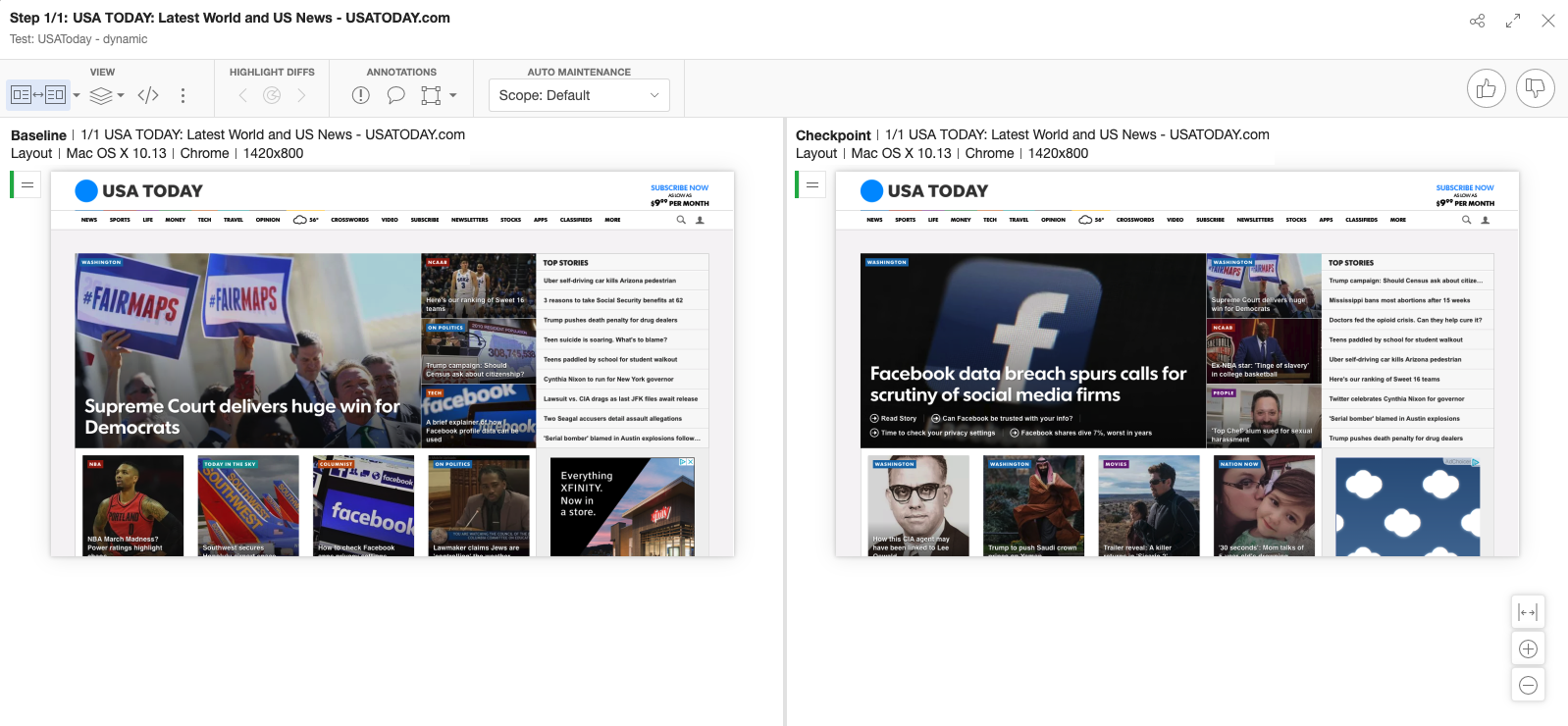 This is a comparison of two different USA Today homepage images. When an AI-powered tool looks at the layout comparison, the layout framework matters, not the content. Layout comparison ignores content differences; instead, layout comparison validates the existence of the content and relative placement. Compare that with a bitmap comparison of the same two pages (also called “exact comparison:):