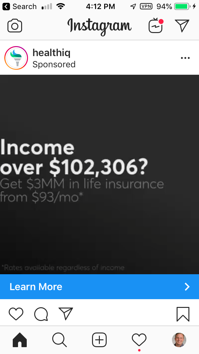 To see what I mean, let’s look at an Instagram ad screen that’s properly rendered. There are 21 visual elements by my count — various icons, text. (This ignores iOS elements at the top like WiFi signal and time, since those aren’t controlled by the Instagram app.)