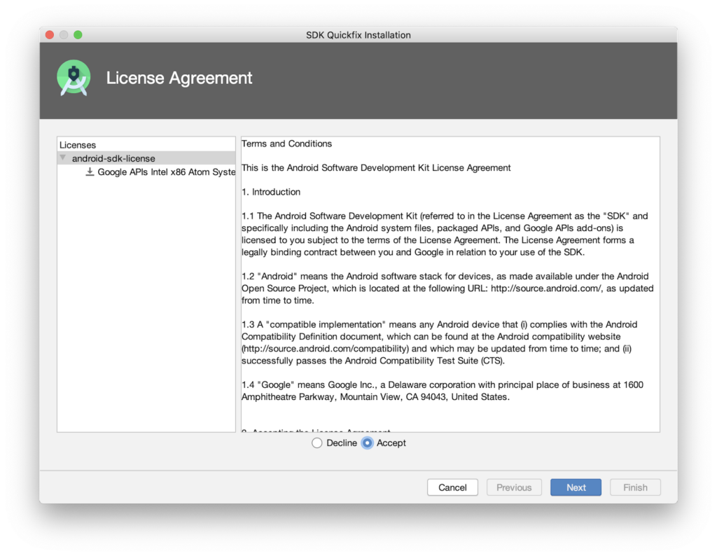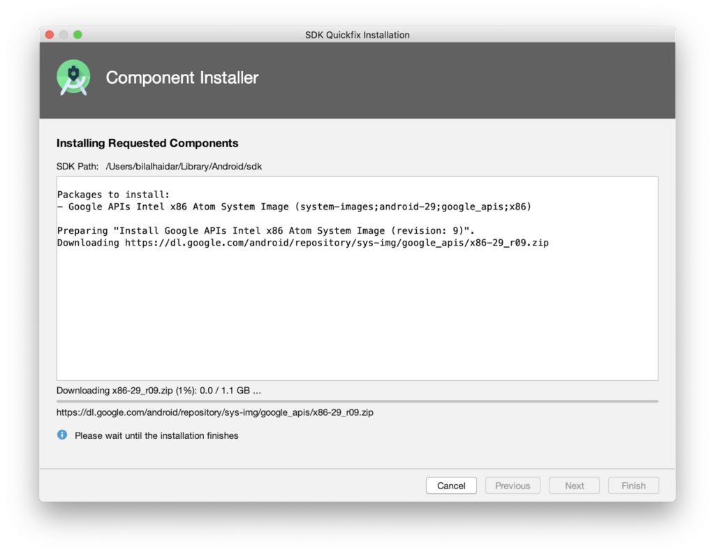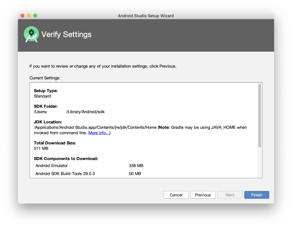 Notice the location where the Android SDK was installed. It’s /Users/{User Account}/Library/Android/sdk.