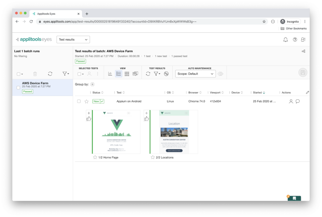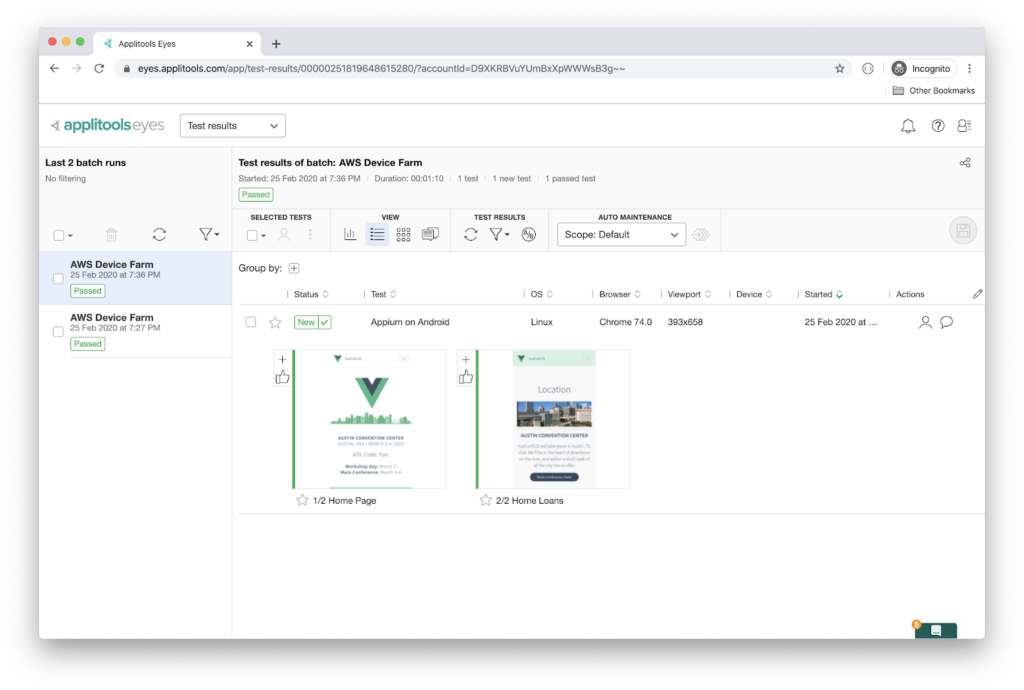 Switch back to the Applitools Test Manager, and verify the results of this second run via AWS Device Farm.