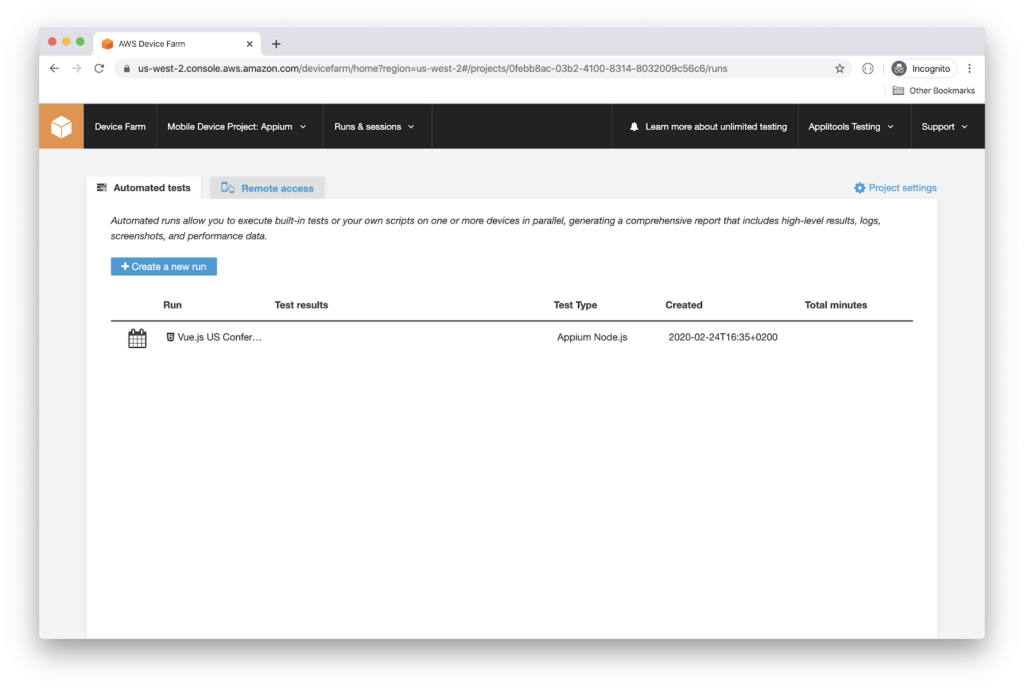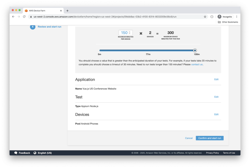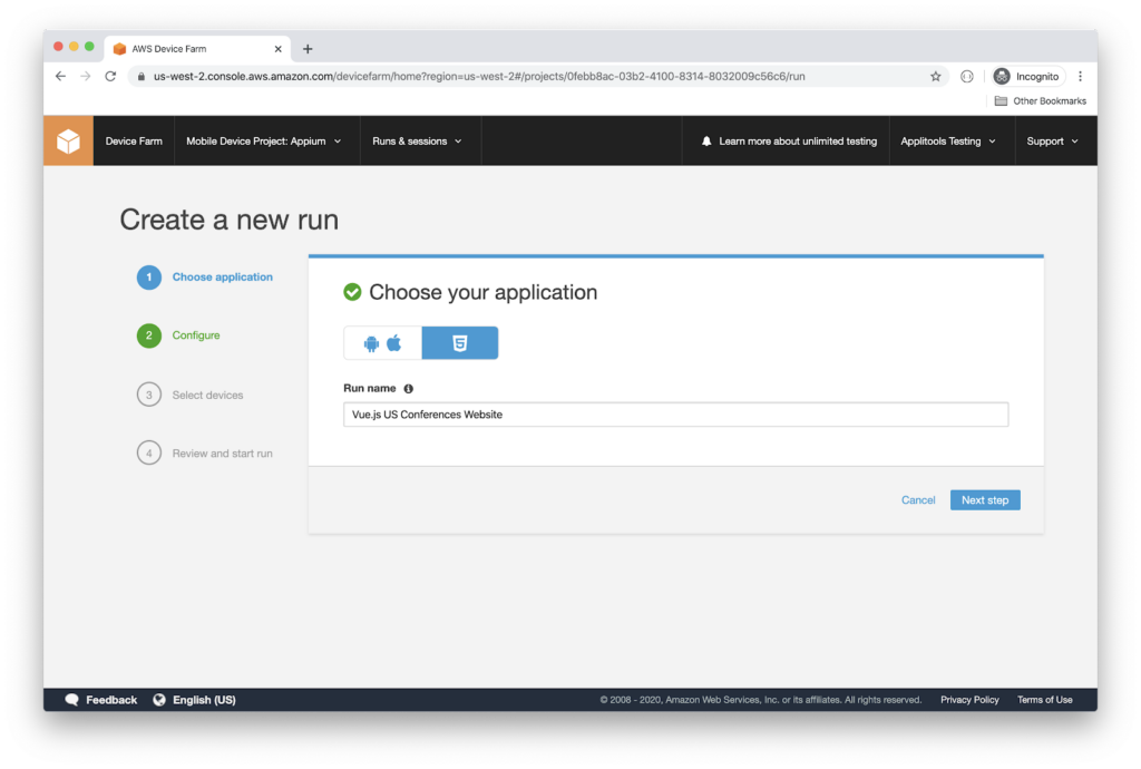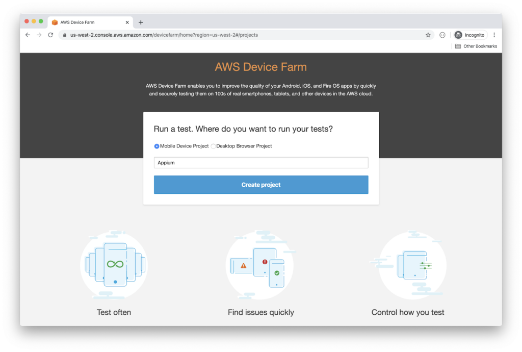 Now that the test runs locally, let’s run it on AWS Device Farm. Start by creating a new account on Amazon Web Service website.
