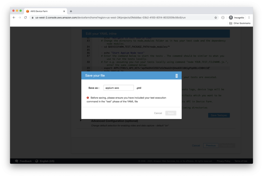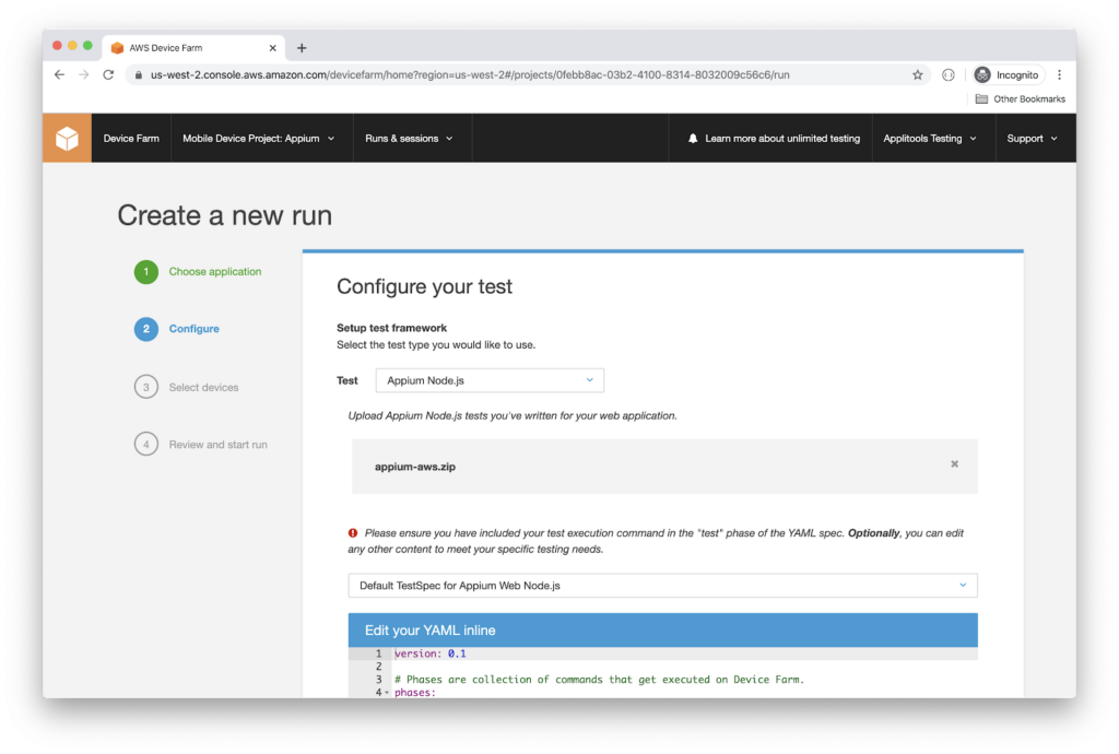 Now you can upload the .zip file to AWS Device Farm.