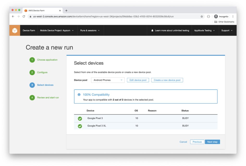 - It’s time to select the devices that you want to run the test script against. I will pick up a customized list of devices. Therefore, click the Create a new device pool button.