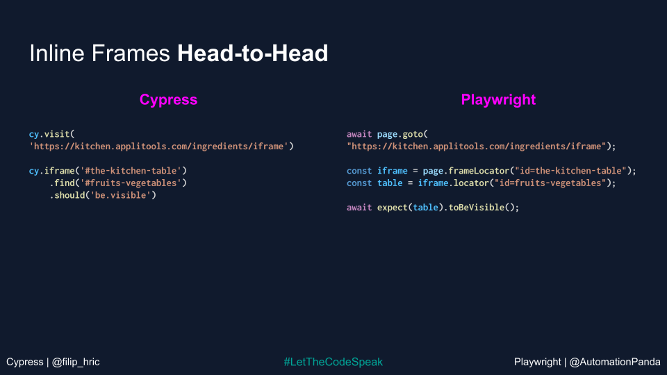 Although iframes are not as common as they used to be, they can still present a challenge to QA engineers. In fact, they need an additional plugin in Cypress, which was probably why it lost this round. Playwright has native API to switch to any given iframe that takes away the extra leg work of installing a plugin.