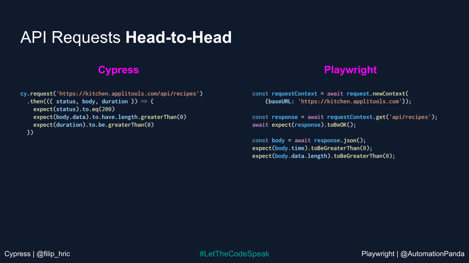 On the 26th of May Applitools hosted another “Let the Code Speak!” event. This time it was focused on two rising stars in web test automation – Cypress and Playwright. Both of these tools have huge fan bases and users that have reasons to either love or doubt these tools. The event had more than 500 attendees that decided on the ultimate winner. To determine the best framework, I (Filip Hric) and Andrew Knight a.k.a Automation Panda shared short code snippet solutions on various different testing problems in front of an online audience. Right after each example, the audience got to vote for the better solution in each of the 10 rounds.