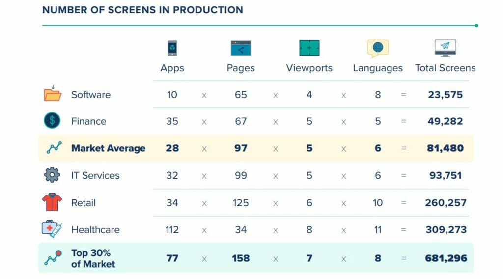 At the same time, the number of screen combinations (between screen sizes, devices and versions) is rising quickly. In recent years the number of screens required to test has exploded, rising to an industry average of 81,480 screens and reaching 681,296 for the top 30% of companies.
