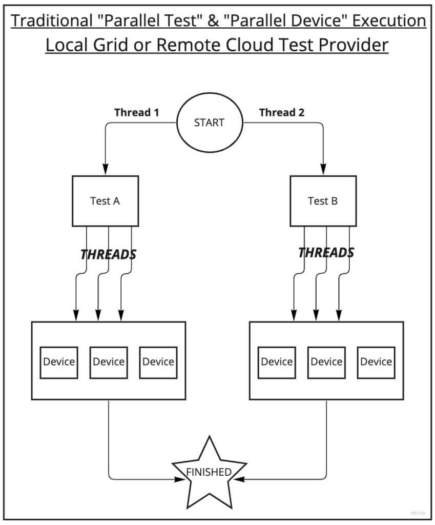 This is the most efficient and fastest traditional approach as it parallelizes both your test suite and devices for cross-device validations. However, it comes at a cost of machine resources, cloud concurrency or minutes usage on license limits (if applicable), and added complexity in your test framework having to manage different sets of parallelization. Some frameworks have this architecture “baked” into them but for many others, it’s up to the developer/tester (or whomever) to implement this logic themselves.