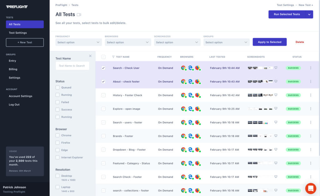 With Preflight, you create tests by using your product – we’ll record all the elements and interactions that happen along the way so that you can easily replay it on different browsers and screen sizes.