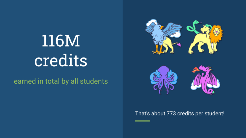 The credit total is even more impressive. Our students have earned about 116 million course credits. That’s just under 800 credits per student, which correlates to about one course’s worth of credits. 116 million credits earned is a mind-blowing number, and that total is only going to increase with time.