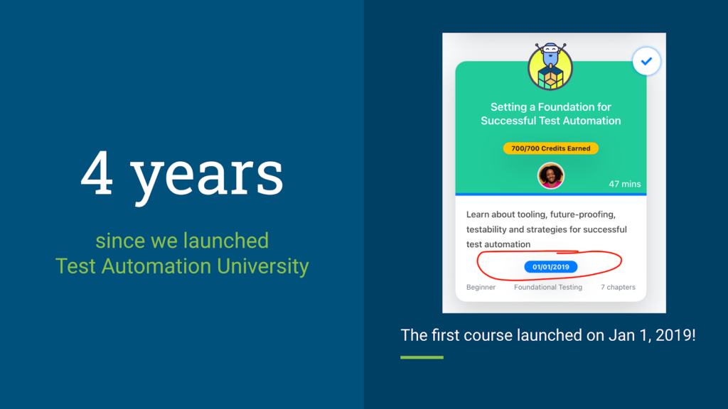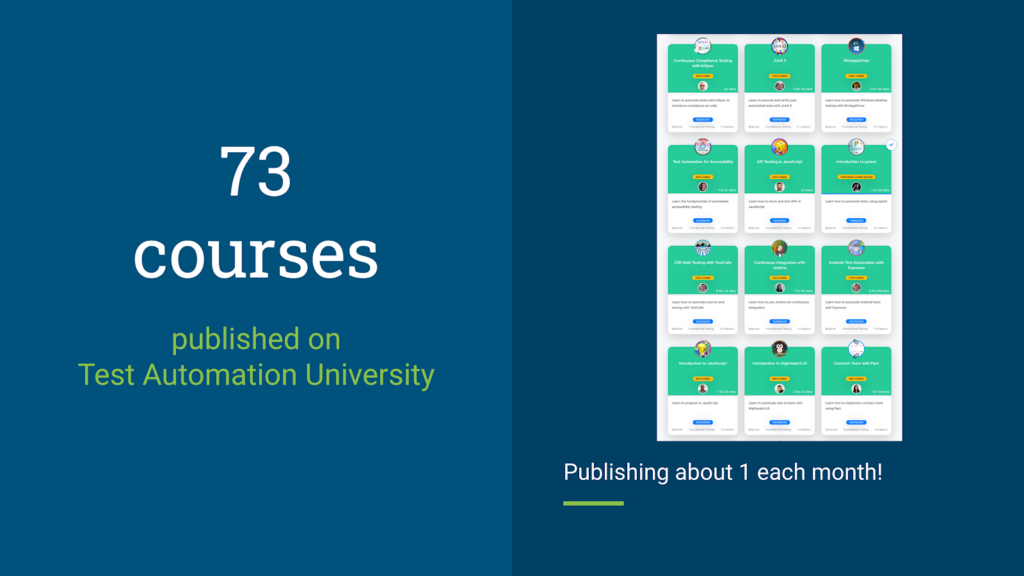 Now, I can’t imagine a world without TAU. At least once a week, someone I’ve never met before slides into my DMs and asks me, “Andy, how can I start learning about testing and automation?” I literally just tell them, “Have you heard of Test Automation University?” Boom. Done. I don’t have to check my bookshelf for titles or do a quick search for blog articles. I just say go to TAU. They’re always grateful.