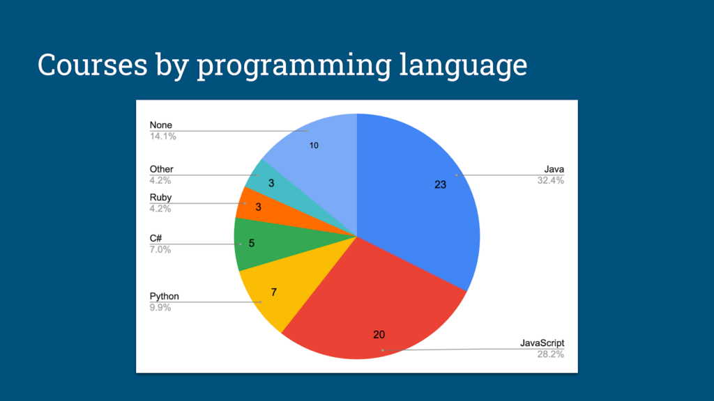 When partitioning the full catalog of courses by the programming languages they use, we can see that Java and JavaScript dominate the landscape. This should be no surprise, since those two languages are by far the most popular languages for test automation. Applitools product data also backs this up. TAU offers a good number of Python and C# courses that are reasonably popular. I personally developed 3 of those 7 Python courses. TAU also offers a handful of courses that use Ruby and other languages. Unfortunately, however, we have discovered that those courses, especially for Ruby, have very low completion rates. Again, I surmise that this reflects broader industry trends.