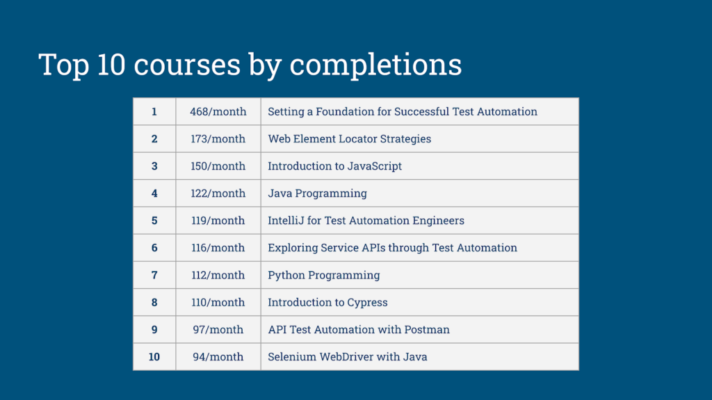 Our top 10 courses are all in that upper echelon of completion rate. Our most popular course by far is Angie Jones’ Setting a Foundation for Successful Test Automation, followed by my course, Web Element Locator Strategies.